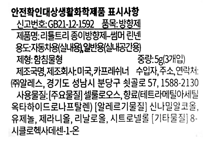 제품에 사용된 화학물질 명칭 | 상품 상세페이지 참조 |