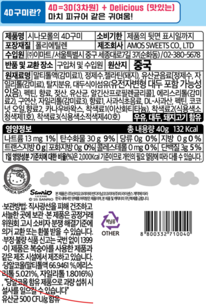 산리오 시나모롤 4D 구미 40g