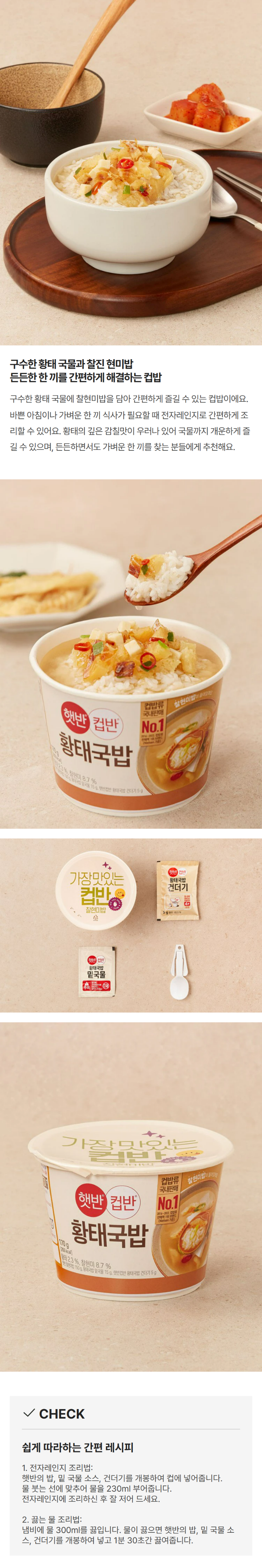 | 원재료명 및 함량 | 햇반[멥쌀(국산),쌀미강추출물], 황태국밥밑국물[황태밑국물CJ(명태/러시아산),황태엑기스분말(명태/러시아산),조개밑국물EX,사골농축액,정제소금], 햇반컵반황태국밥건더기(중국산) |