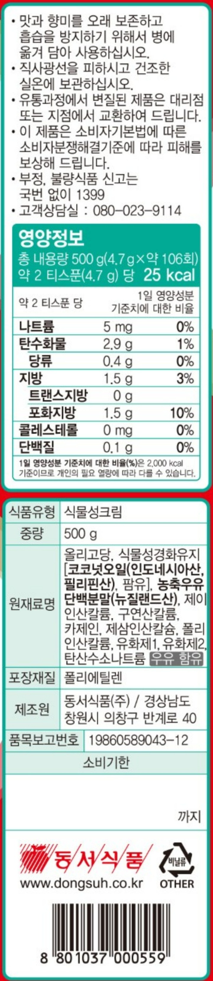 | 생산자 및 소재지 | 동서식품 인천공장:인청광역시 부평구 새벌로 55 창원공장:경상남도 창원시 의창구 반계로 40 (상세설명 참조) |