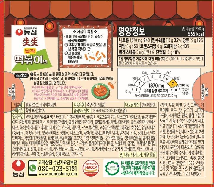 | 생산자 및 소재지 | 농심, 서울시 동작구 여의대방로 112 |