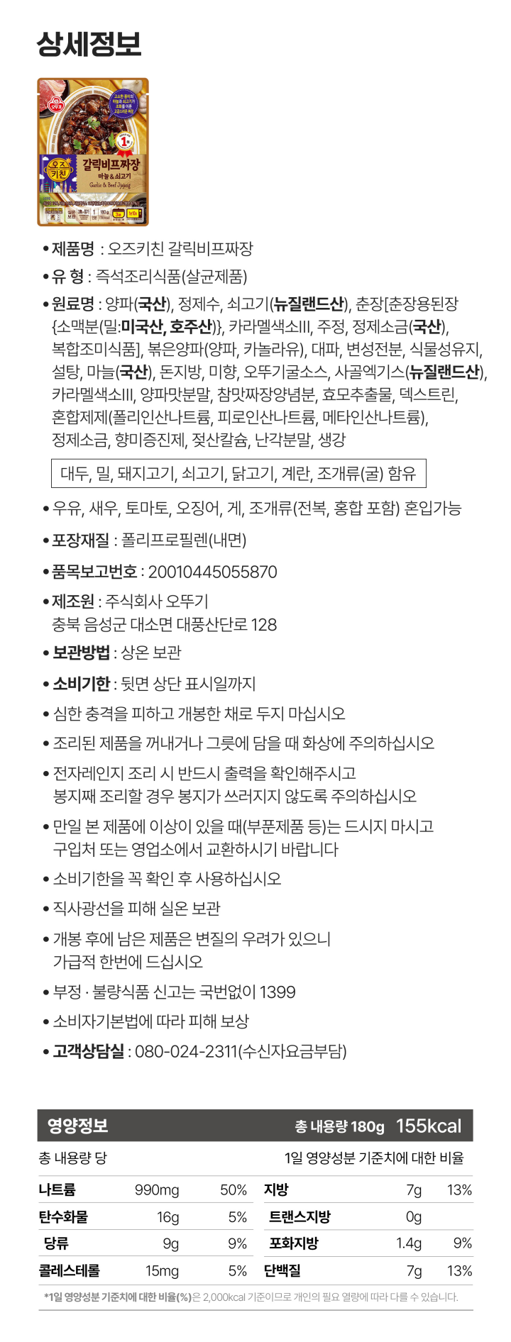 오뚜기 오즈키친 갈릭비프 짜장 180g