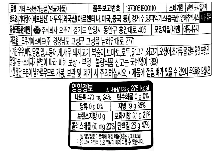 | 원재료명 및 함량 | (농수산물의 원산지 표시에 관한 법률에 따른 원산지 표시 포함) |
