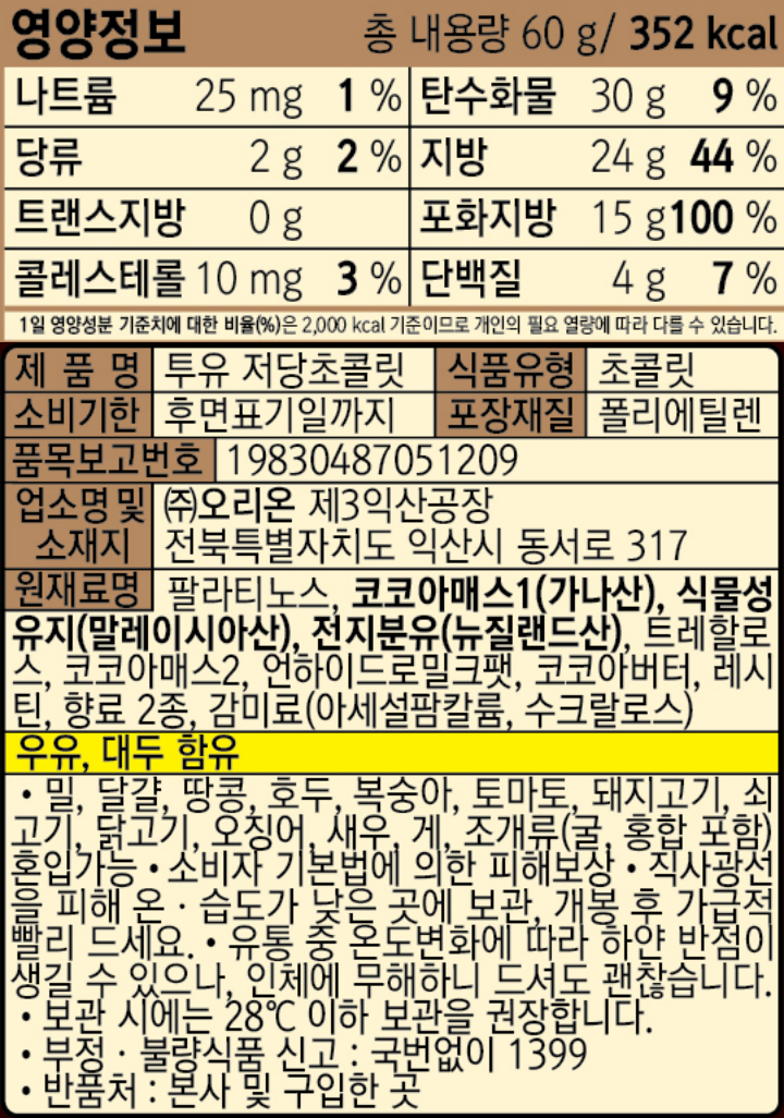 오리온 투유 저당초콜릿 60g