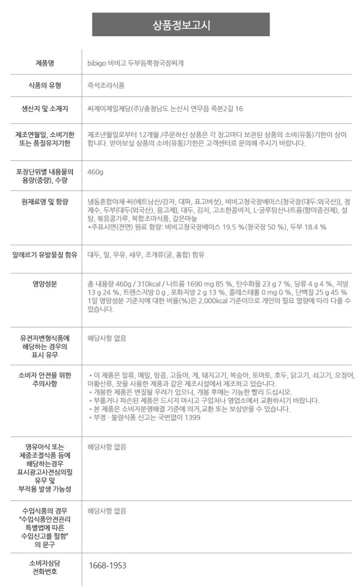 CJ 비비고 두부듬뿍 청국장찌개 460g