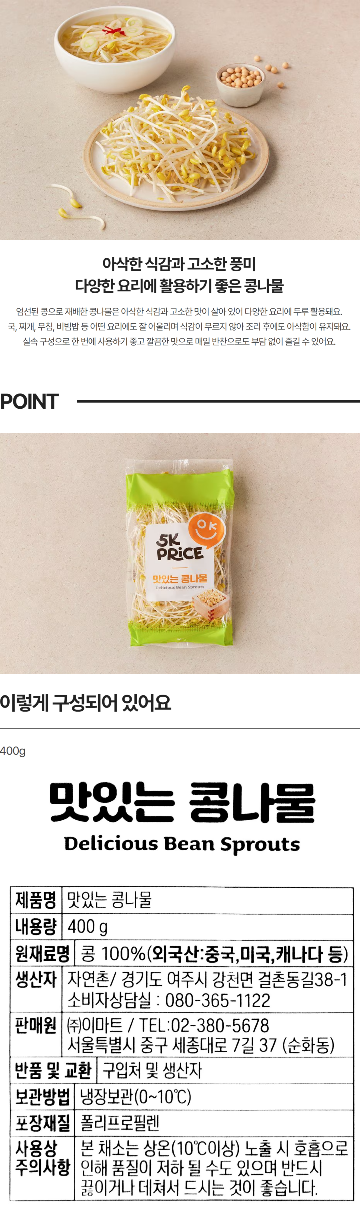 5K프라이스 콩나물은 신선하고 아삭한 식감이 살아 있어 요리에 바로 활용하기 좋았어요. 뿌리가 길고 깨끗하게 정리되어 있어서 손질이 간편했고, 비린내나 잡맛이 거의 없어 데치거나 무쳐도 깔끔한 맛이 유지됐어요. 국이나 찌개, 나물 무침 등 다양한 요리에 두루 활용할 수 있어 편리했고, 양도 넉넉해서 가성비가 좋았어요. 전반적으로 신선하고 품질이 안정적인 콩나물이라 자주 이용하기 좋은 제품이었어요.