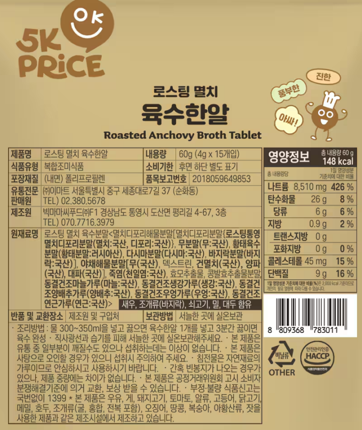 코인 육수로 게 유명한 곳이랑 같은 공장에서 생산 되고성분표에도 써있는 게 똑같아서 구입하게 되었어요. 한알당 그람수가 시중 다른 것보다 약간 적은데 오히려 이 점은 소식하는 저희 집에 딱 알맞은 것 같습니다. 새로 런칭 한 게 너무 좋네요. 계속 나왔으면 좋겠어요.5k 좋은 품질의 착한 가격인것 같아 응원합니다.!