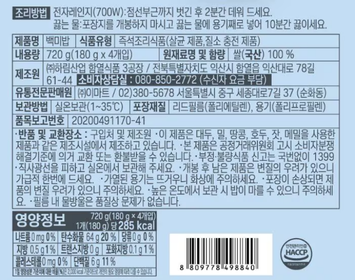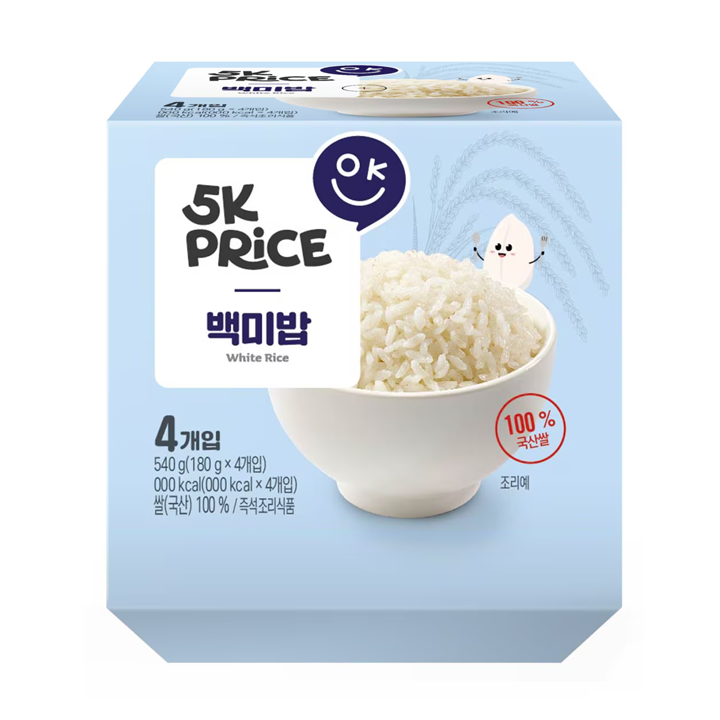 180g 백미밥이 4팩이나 들어있는데, 가격도 저렴해요. 저는 즉섭밥 특유의 냄새가 싫은데, 5K 프라이스 제품은 냄새가 없어서 좋아요.