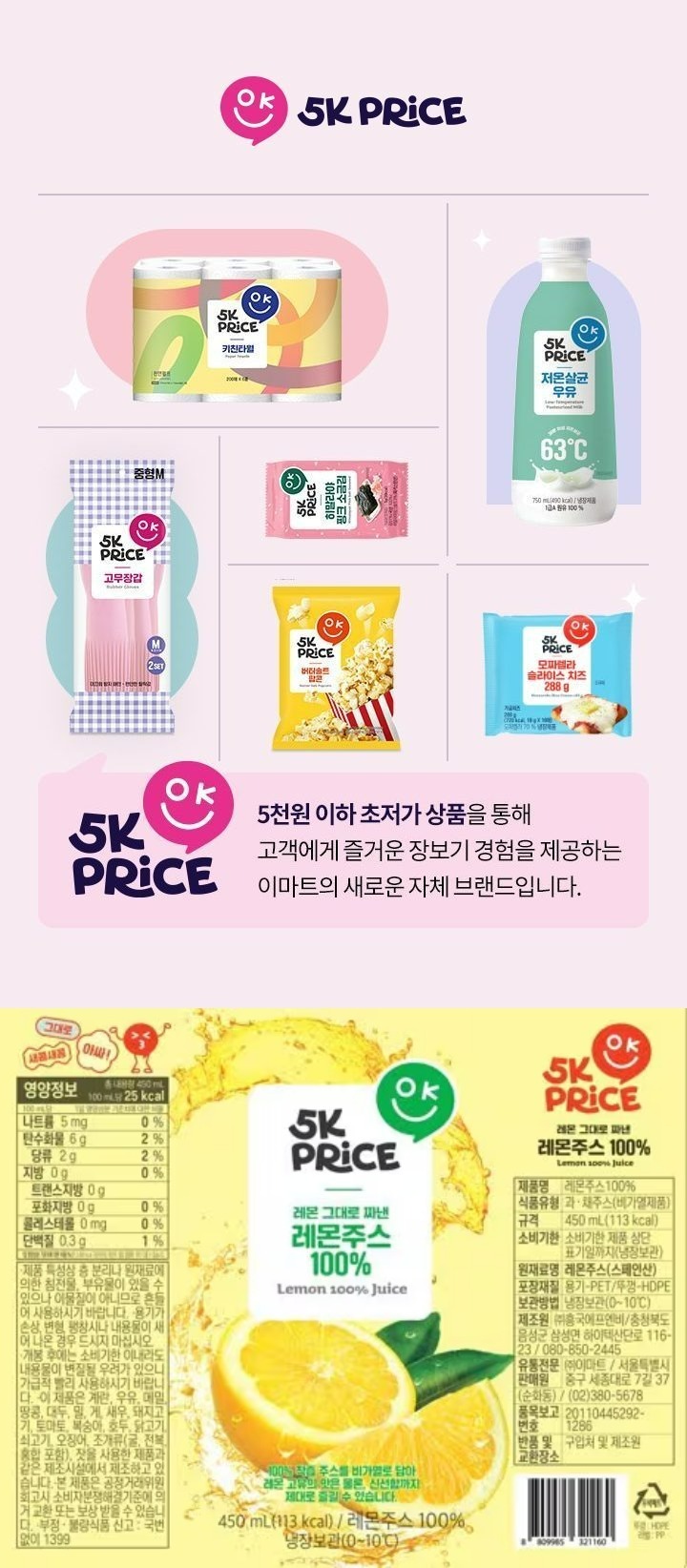 레몬즙 100%에다가 450mL 인데 이 가격인거 너무 놀랍네요 스페인산 레몬 주스가 원재료구요.워낙 대기업이니까 안전하고 위생적일 거라고 믿어 보려고요 5k프라이스 며칠 전에 신제품으로 나온거 같아요
