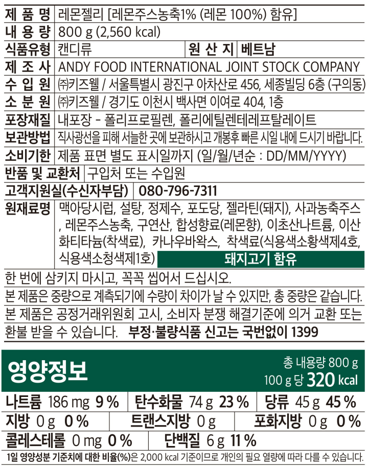 | 생산자 및 소재지 | ANDY FOOD INTERNATIONAL JOINT STOCK COMPANY/ 베트남 |